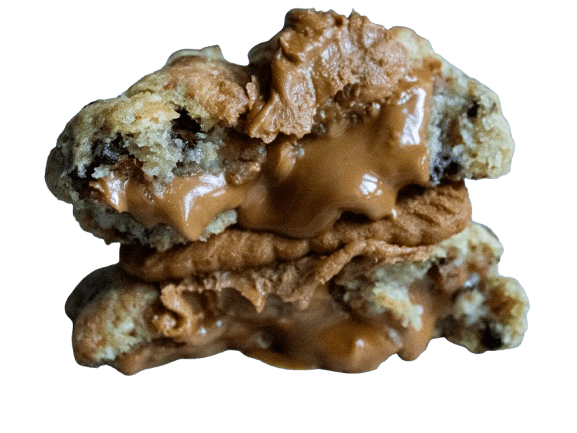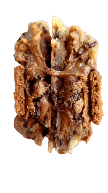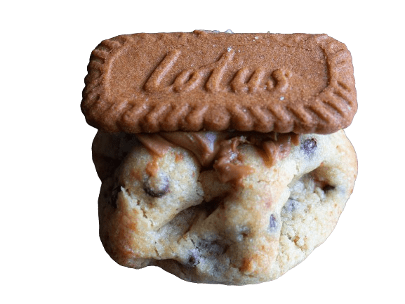 Cookie alla vaniglia e biscotto biscoff in pezzi con gocce di cioccolato fondente, ripieno di crema biscoff – Lotus, topping con crema e biscoff.